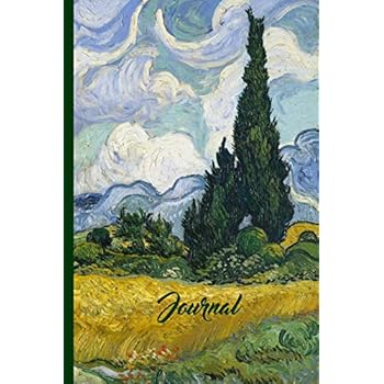 Beautiful artwork from 1889 by the famous painter Vincent Van Gogh, one of my favorite artists from the impressionist period on a pretty 6 x 9 journal with 100 lined pages. This impressionism art landscape diary features tall green cypresses set against pretty swirling clouds above a wheat field.